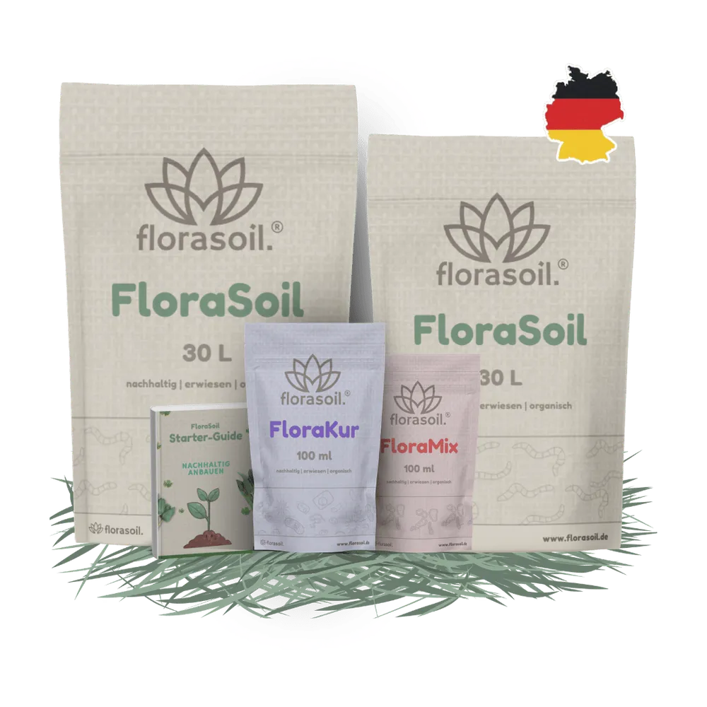 Qualitätsversprechen von FloraSoil: 🇩🇪 Made in Germany | 🌱 Keine Gentechnik | ♻️ 100 % Organisch & Bio-zertifiziert | 🐝 Unbedenklich für Bienen